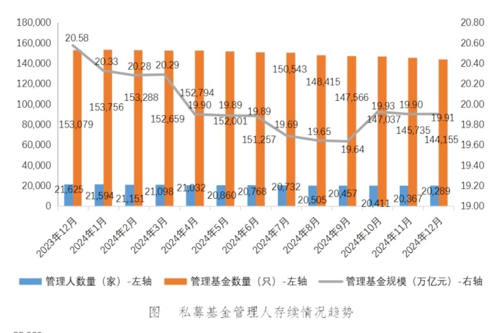 中国基金业协会1月15日发布的数据显示,截至2024年末,存续私募基金管理人20289家,管理基金数量144155只,管理基金规模19.91万亿元。